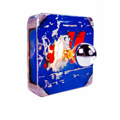 Applique in metallo realizzata con lamiera di bidone recuperata e sorgente luminosa con bulbo LED a calotta cromata. Finitura antiossidante trasparente lucida.