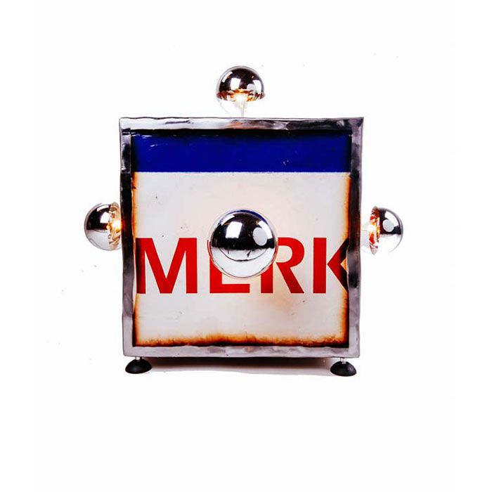 Lampada da tavolo realizzata con lamiere di bidone recuperate saldate tra loro. La sorgente luminosa è costituita da 5 bulbi LED a calotta cromata. Finitura antiossidante trasparente lucida.