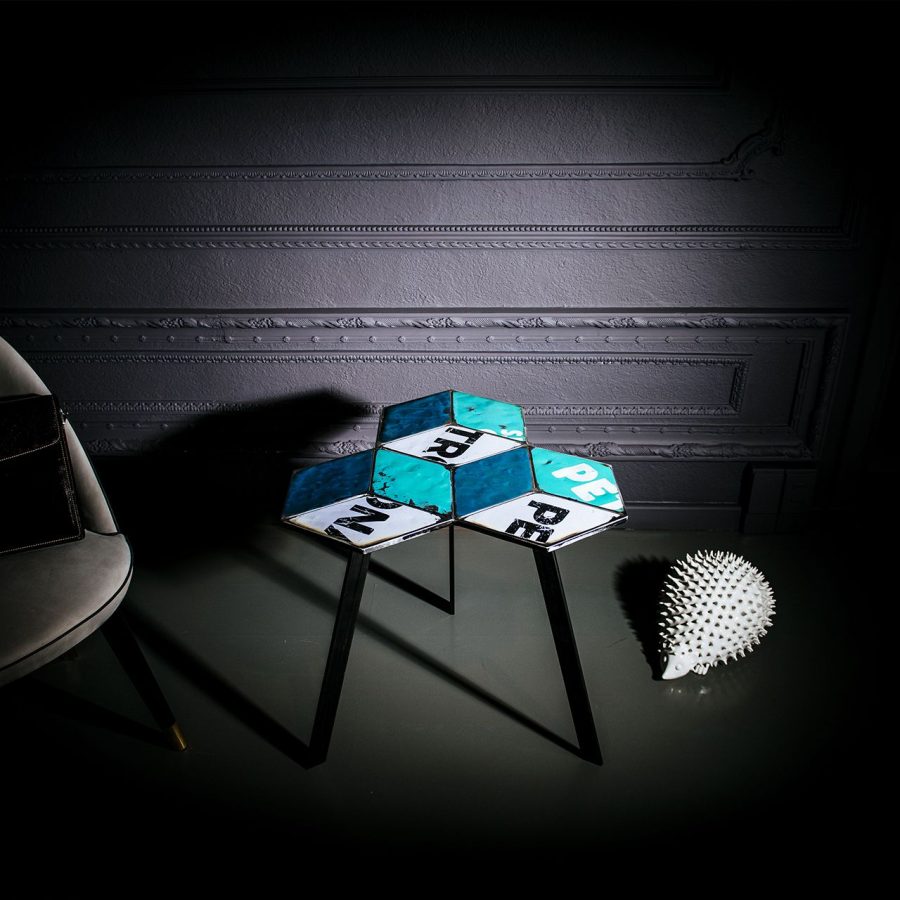 Tavolino da caffè con gambe trapezoidali in tubolare rettangolare verniciato a polvere nera. Piano realizzato con mosaico di moduli esagonali ripetuti in lamiera di bidone recuperata. Top: finitura antiossidante trasparente lucida.