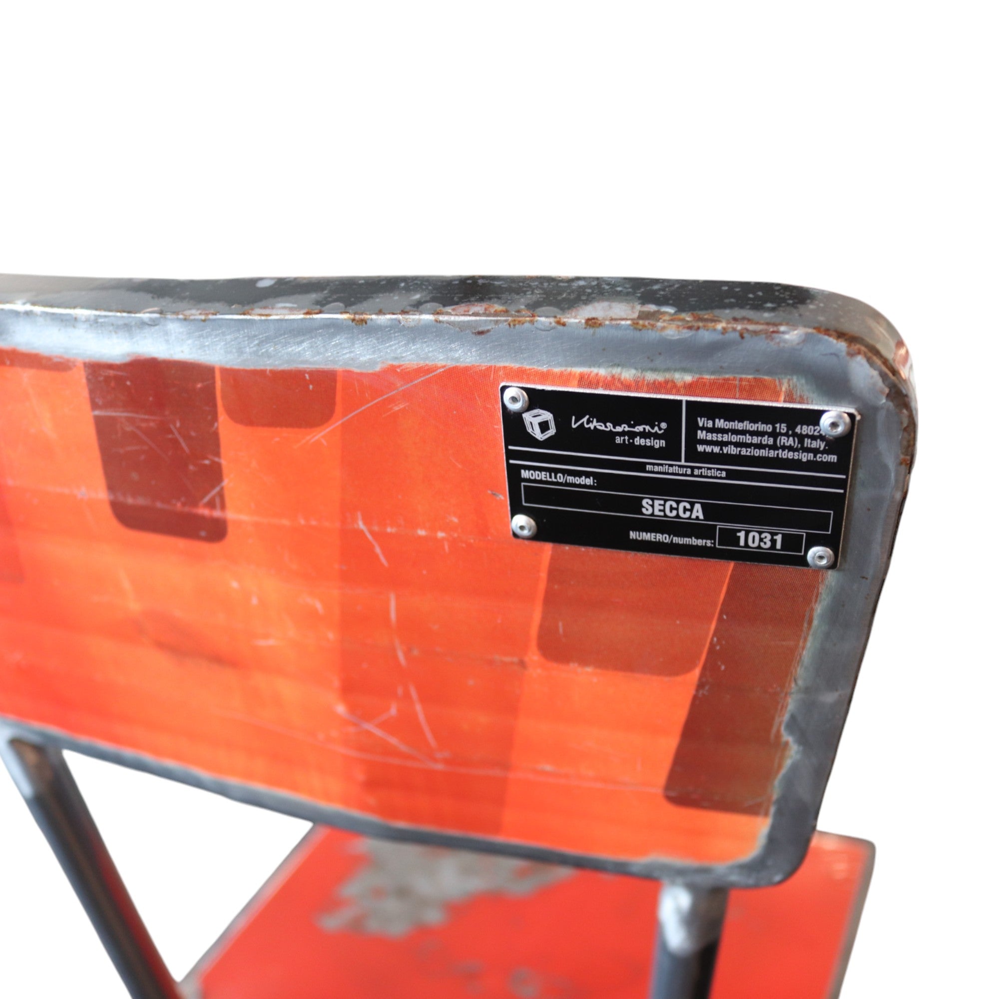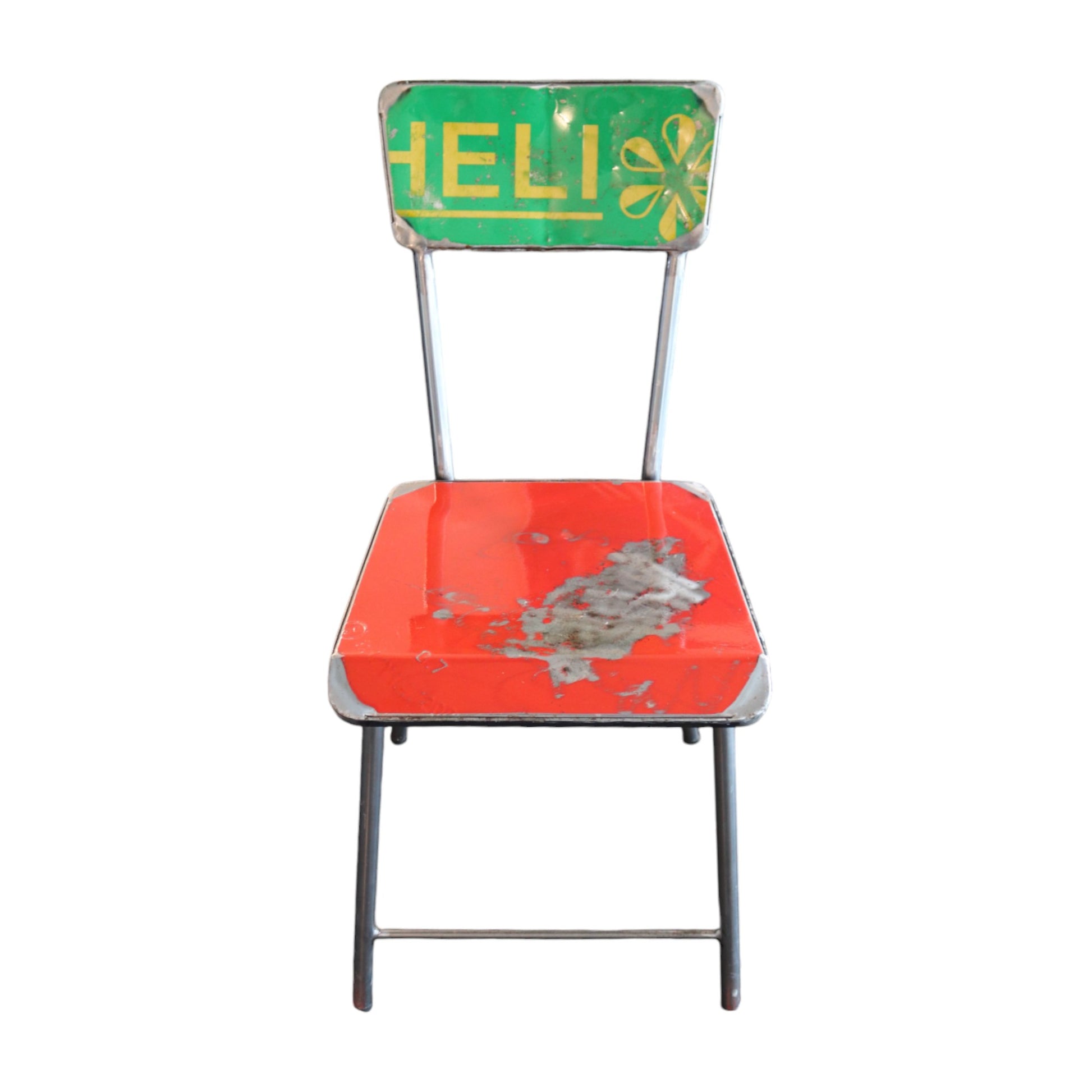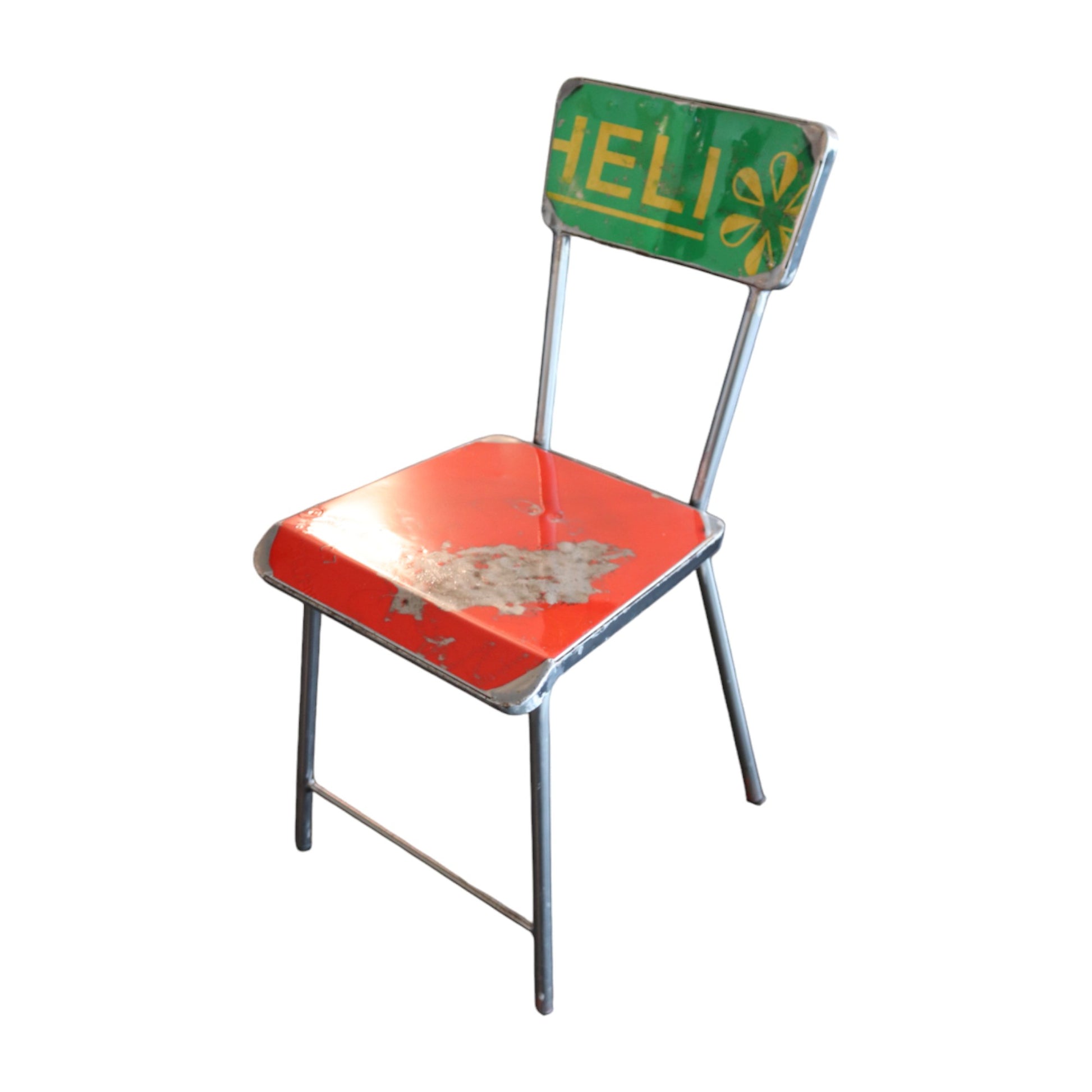 Sedia con telaio in tubolare metallico ed applicazioni in lamiera recuperata nella seduta e nello schienale.