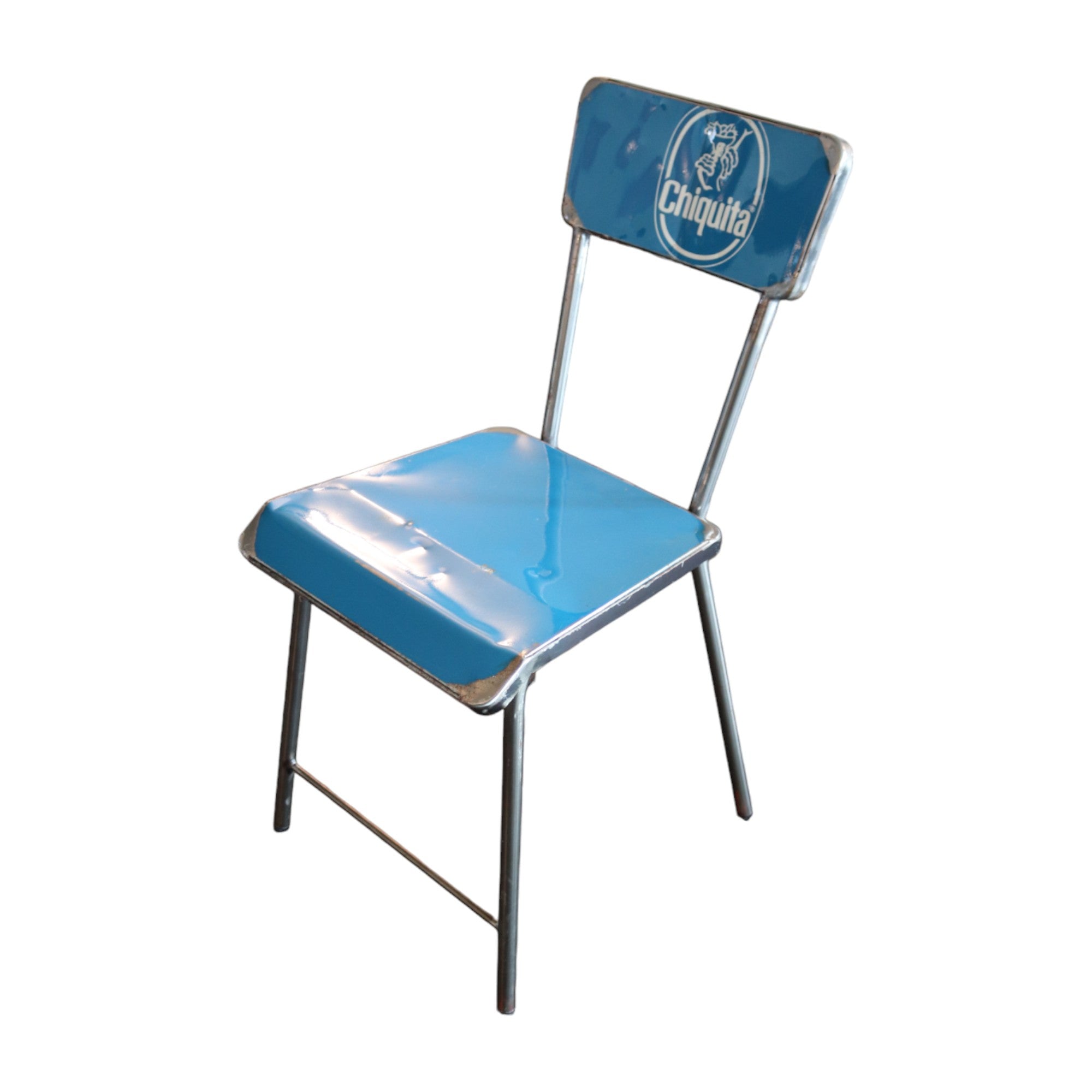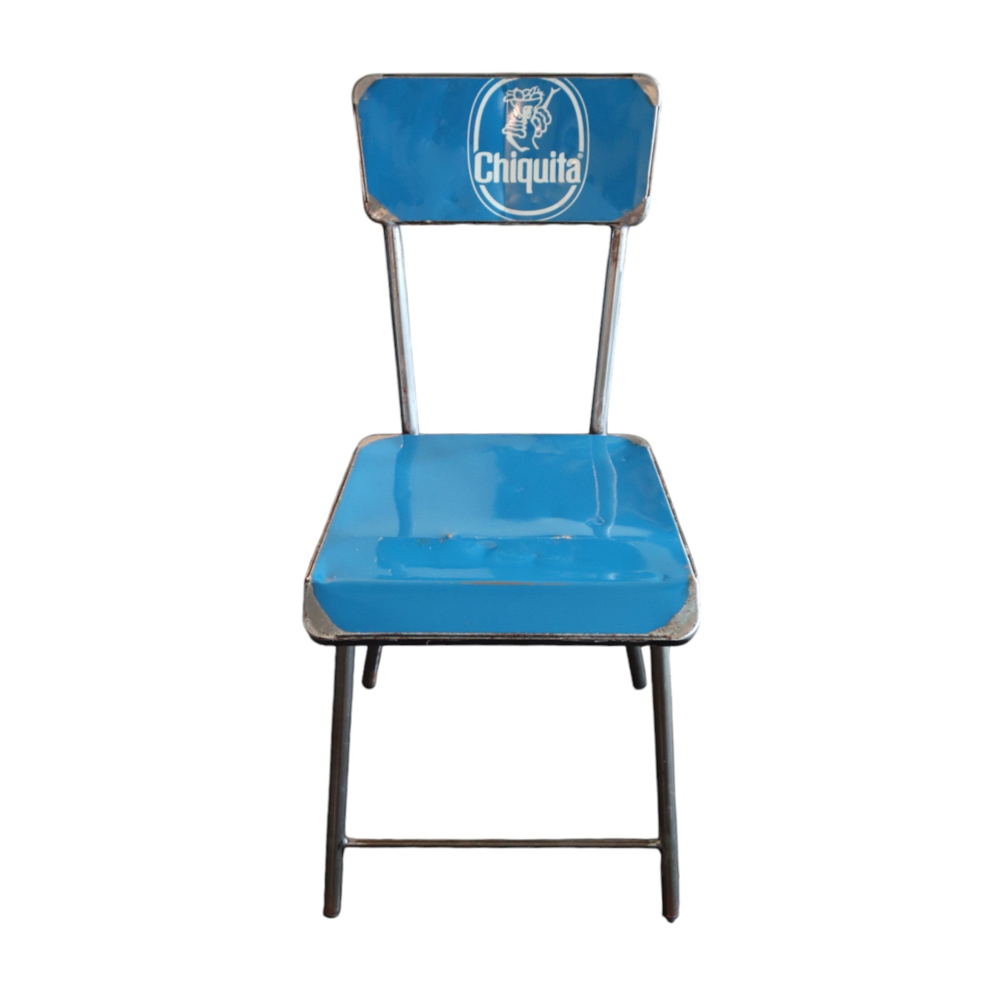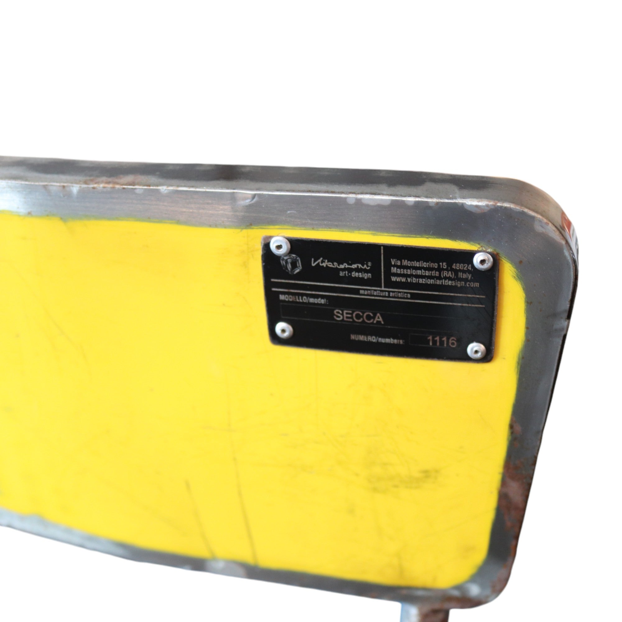 Sedia con telaio in tubolare metallico ed applicazioni in lamiera recuperata nella seduta e nello schienale.