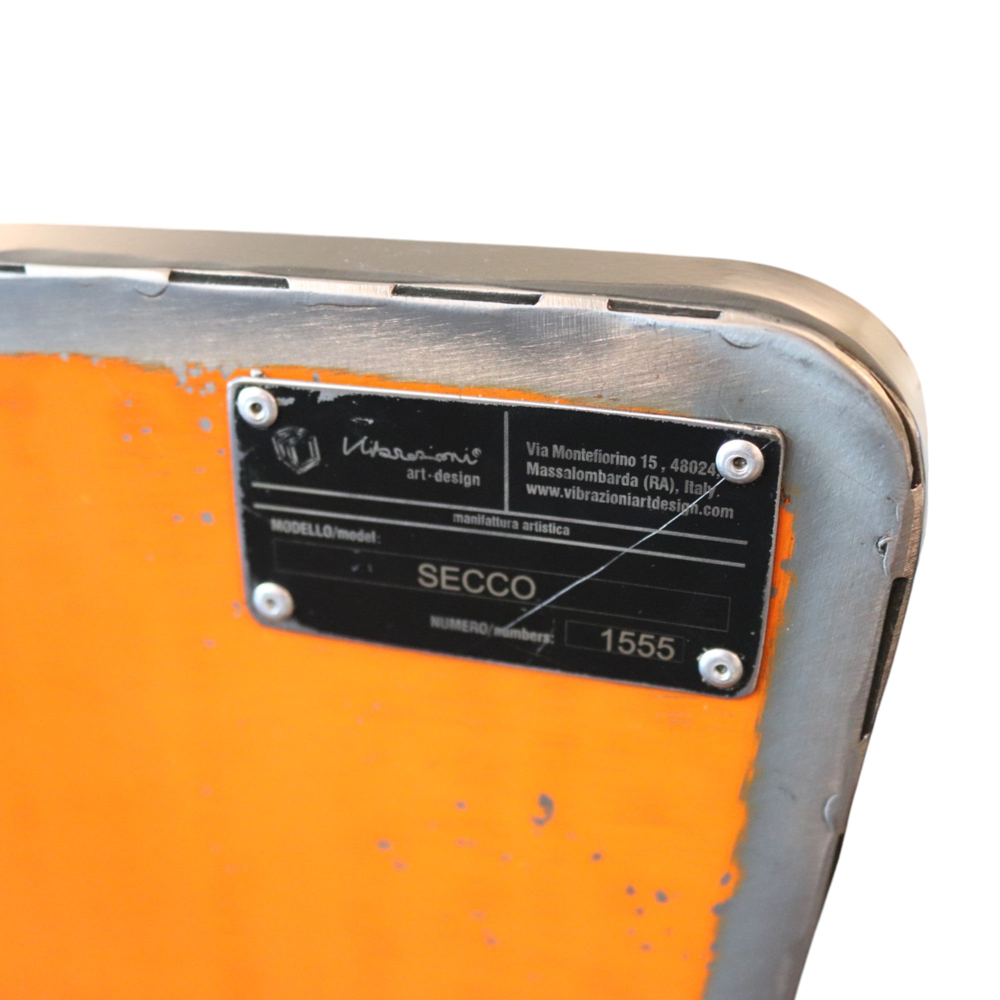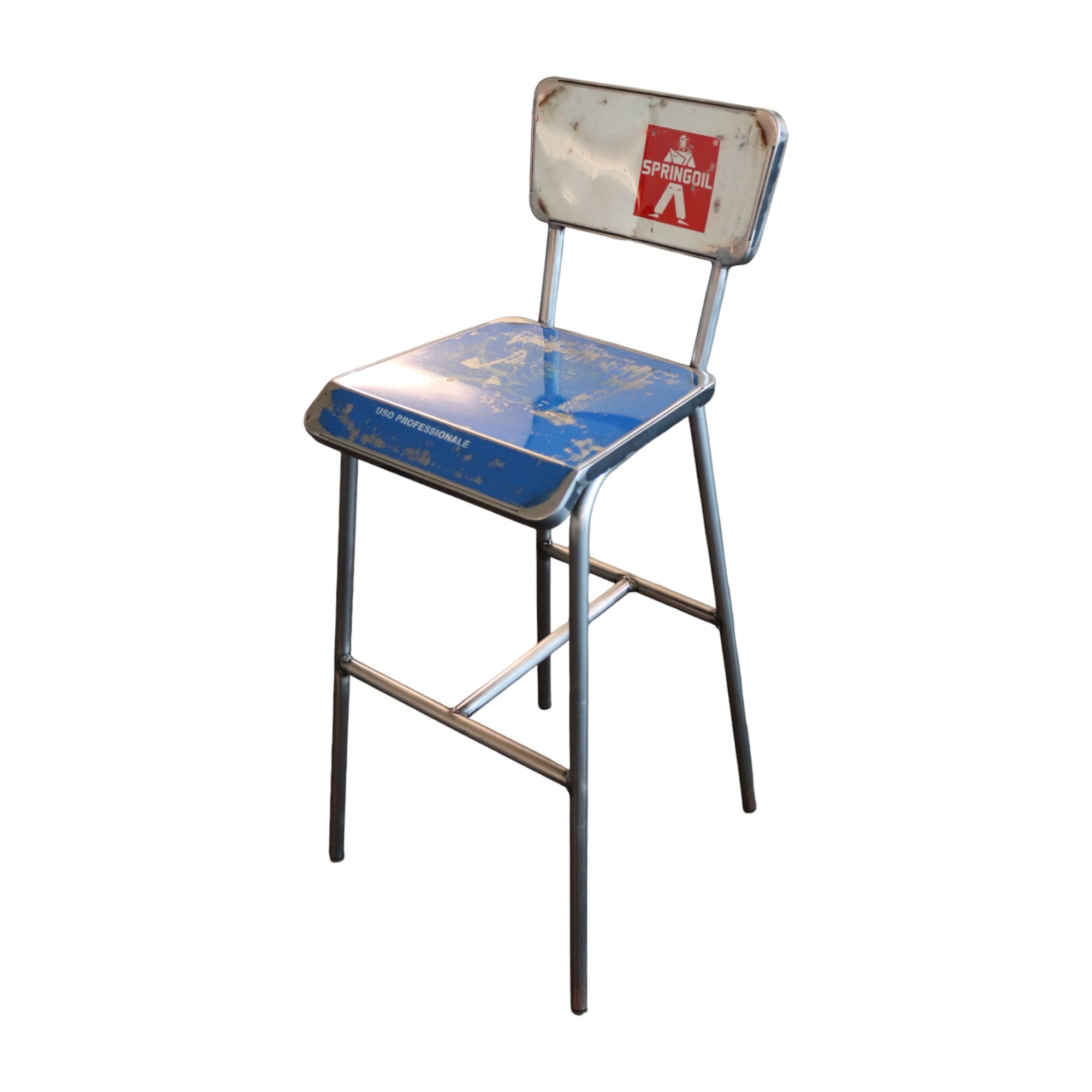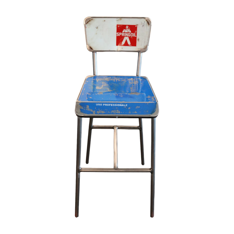 Sgabello con telaio in tubolare metallico con applicazioni di lamiera recuperata nella seduta e nello schienale.