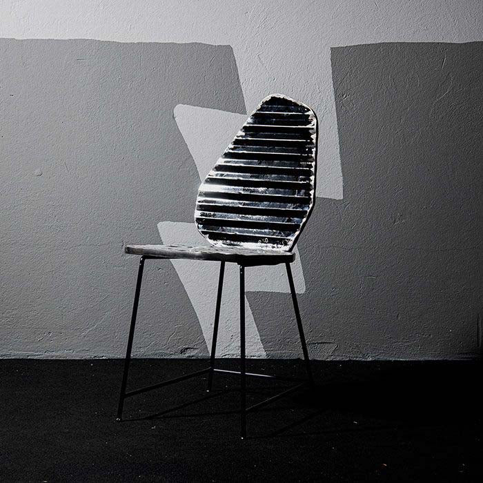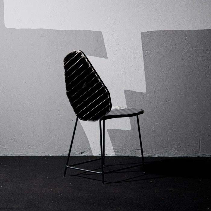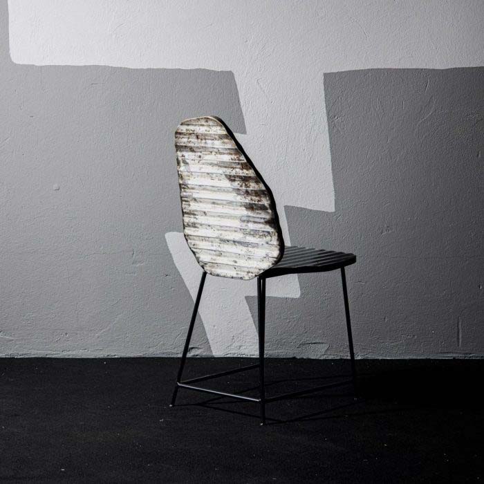 Sedia con gambe in tondino metallico nero, verniciato a polvere. Seduta e schienale realizzati in lamiera di recupero, pieghettata su entrambi i lati (fronte e retro). Finitura trasparente lucida antiossidante.