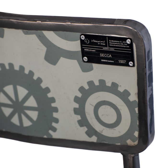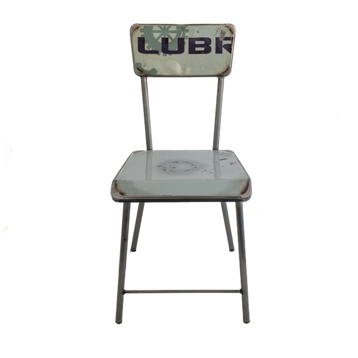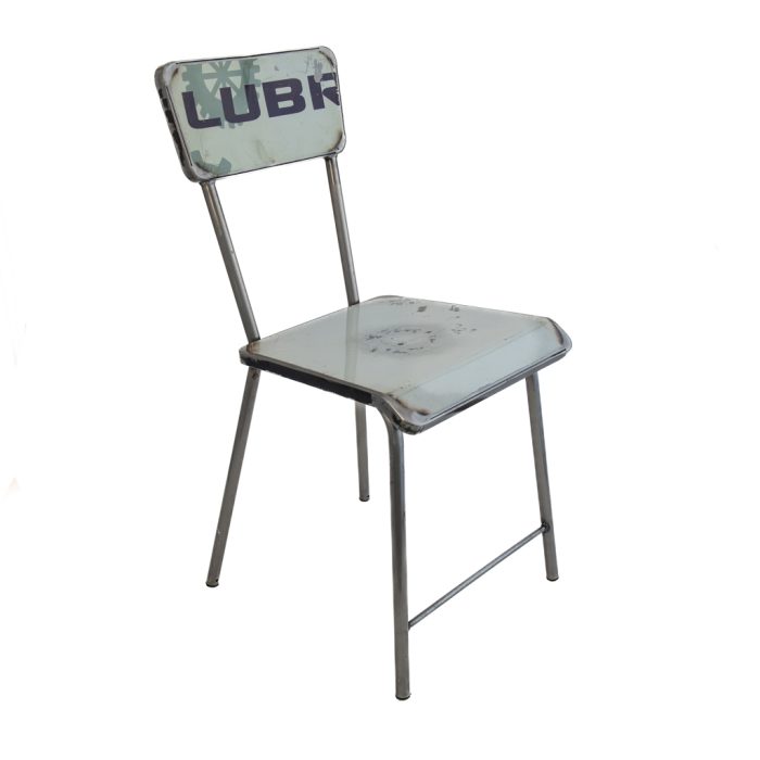 Sedia con telaio in tubolare metallico ed applicazioni in lamiera recuperata nella seduta e nello schienale.