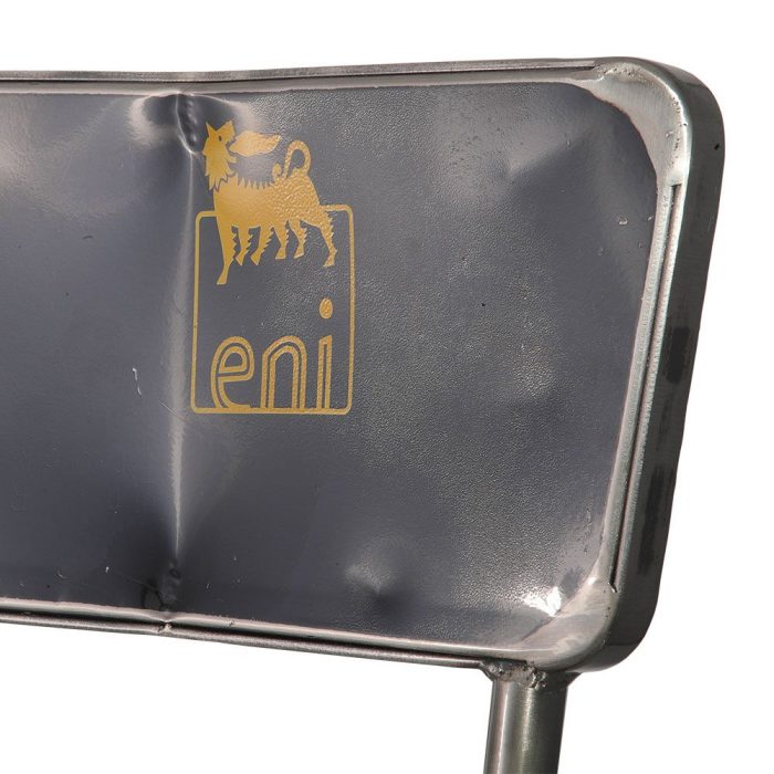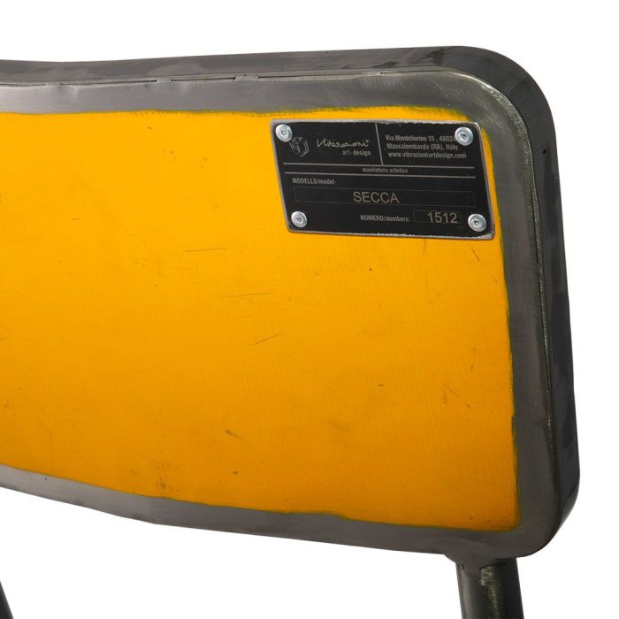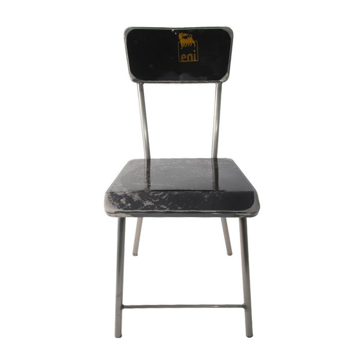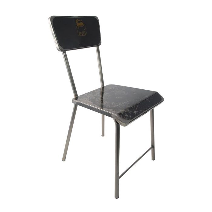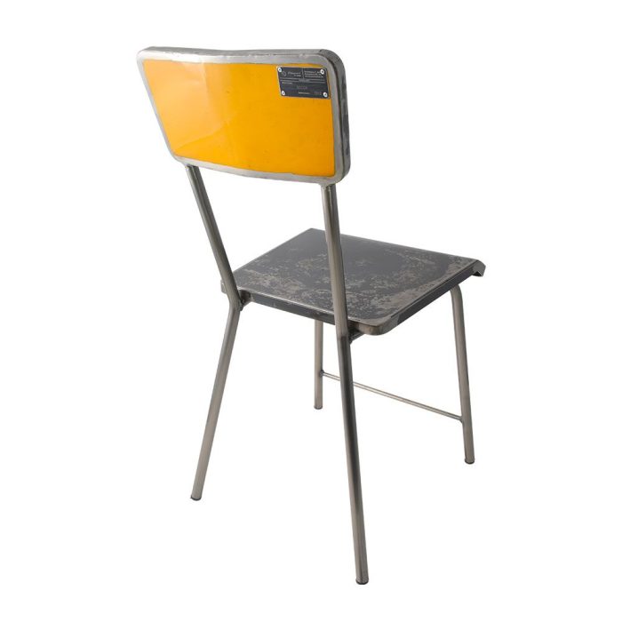 Sedia con telaio in tubolare metallico ed applicazioni in lamiera recuperata nella seduta e nello schienale.