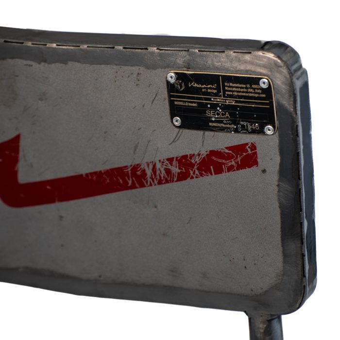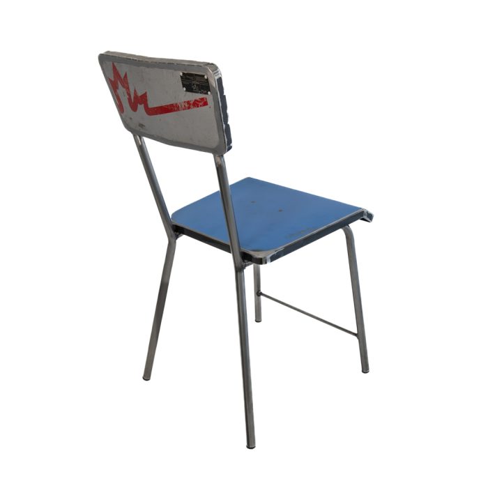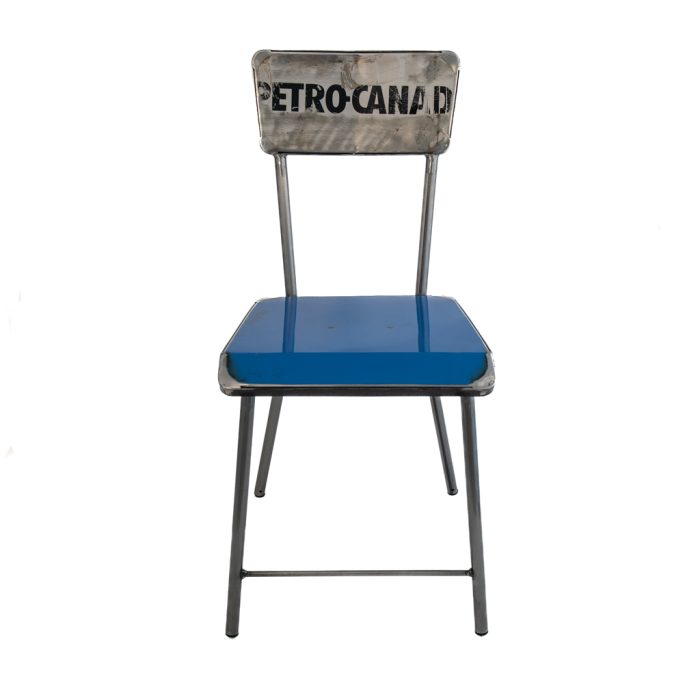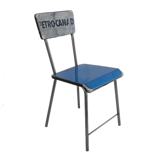 Sedia con telaio in tubolare metallico ed applicazioni in lamiera recuperata nella seduta e nello schienale.