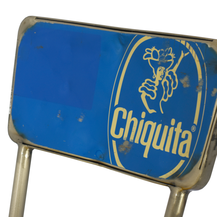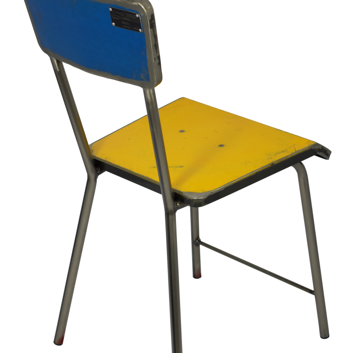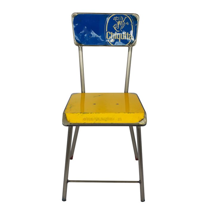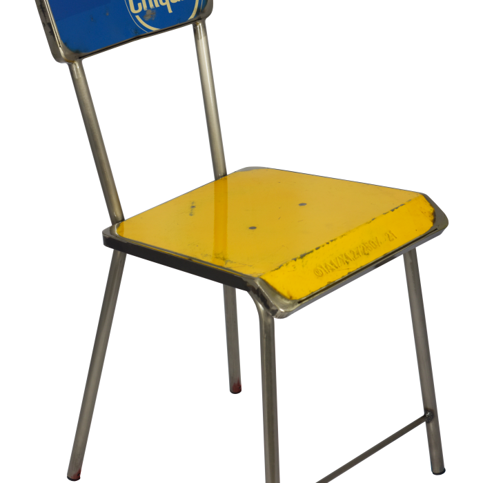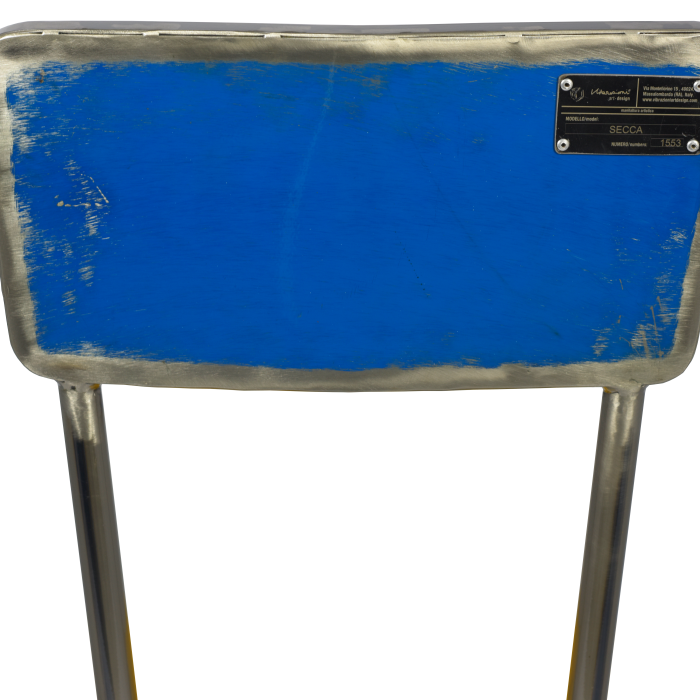 Sedia con telaio in tubolare metallico ed applicazioni in lamiera recuperata nella seduta e nello schienale.