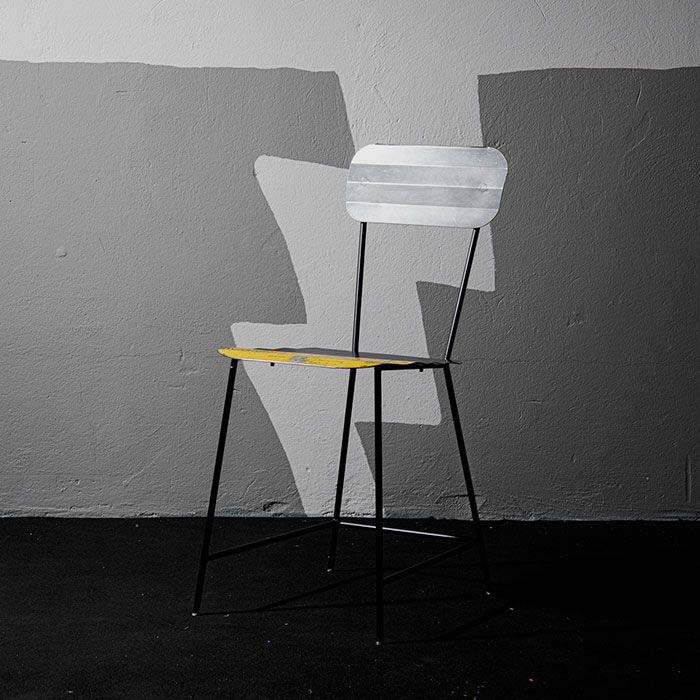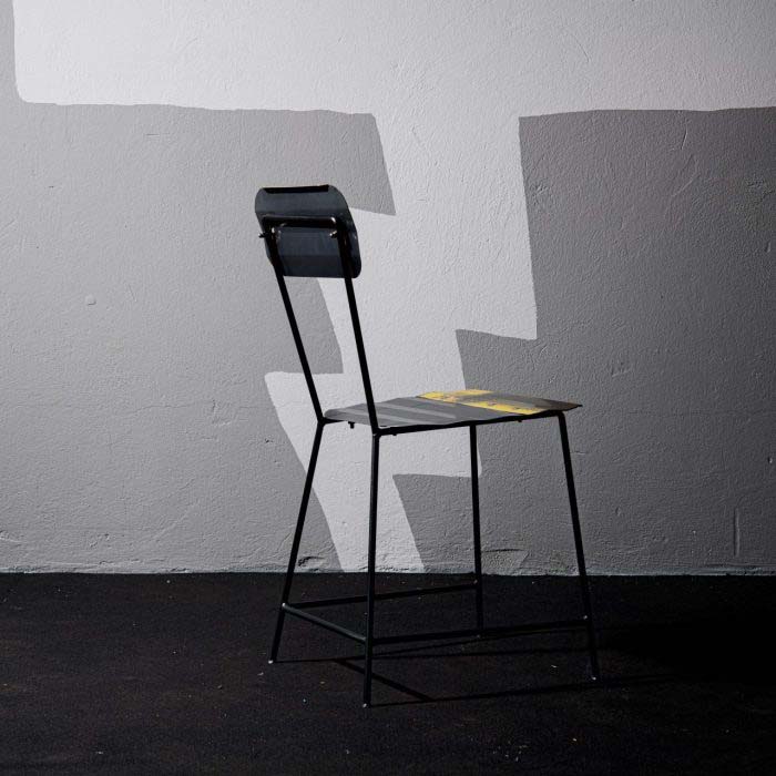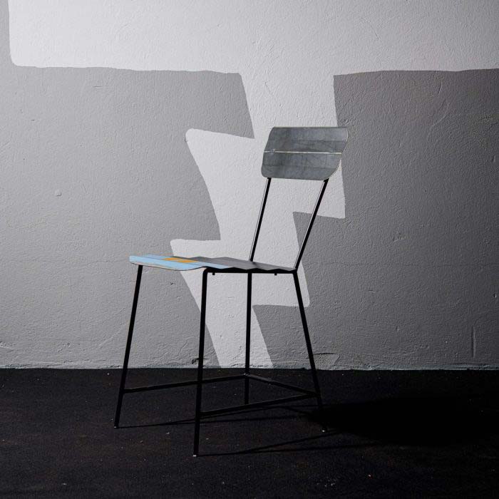 Sedia con telaio in tondino metallico nero, verniciato a polvere. Seduta e schienale realizzati in lamiera vergine pieghettata e rivestimento su una porzione della seduta con inserti di lamiera recuperata. Finitura trasparente satinata antiossidante.
