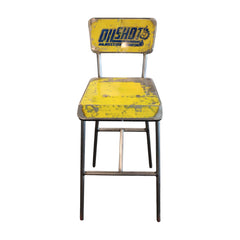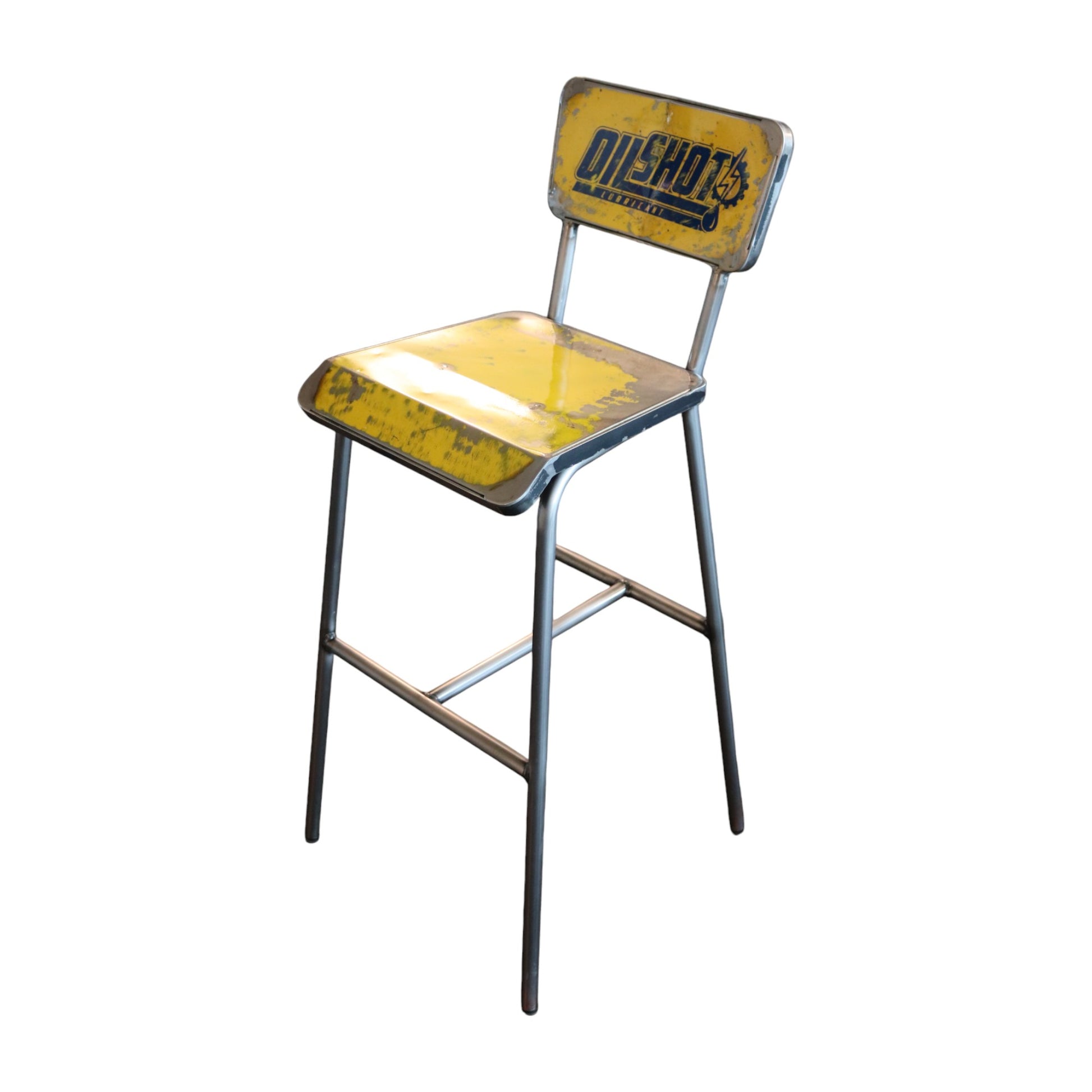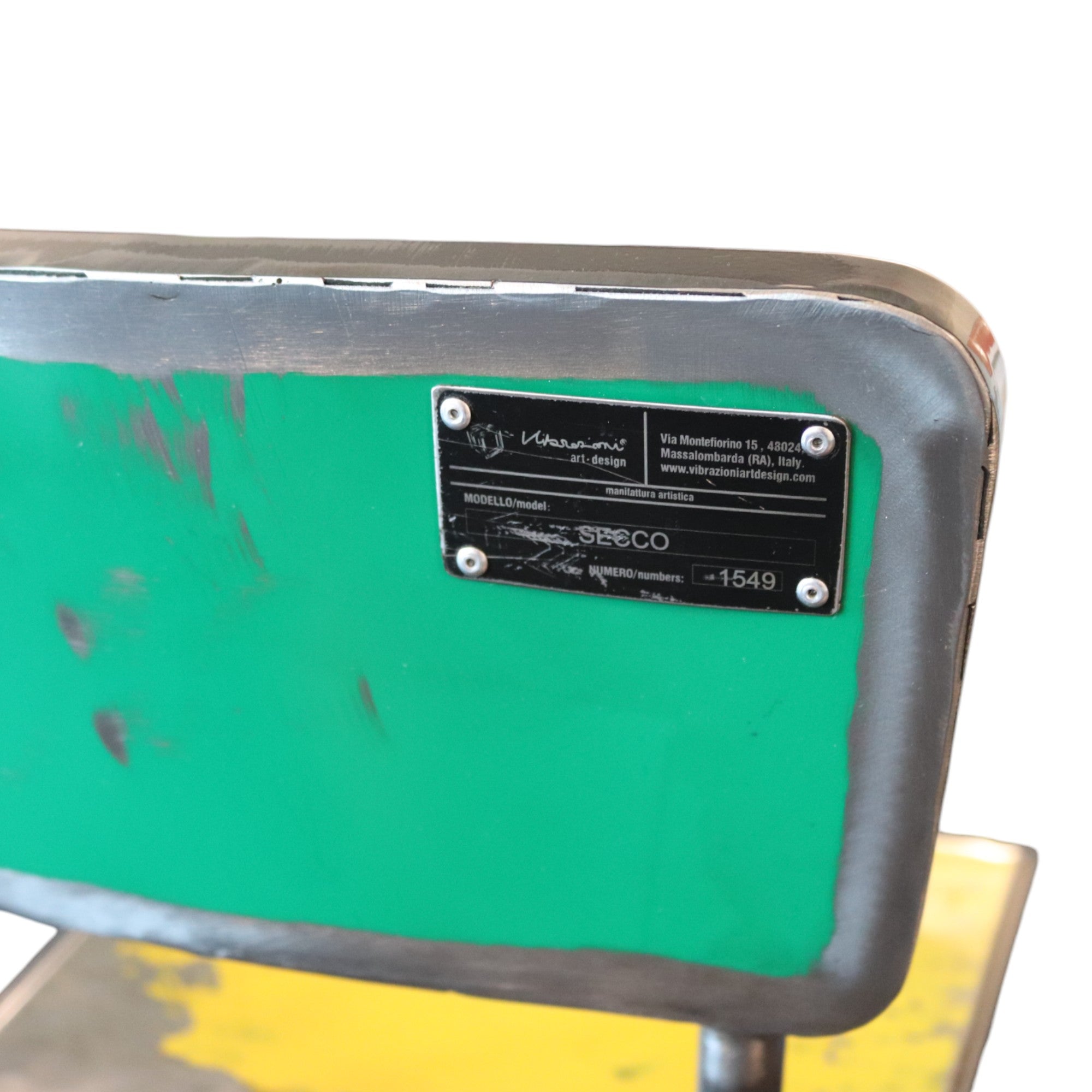 Sgabello con telaio in tubolare metallico con applicazioni di lamiera recuperata nella seduta e nello schienale.