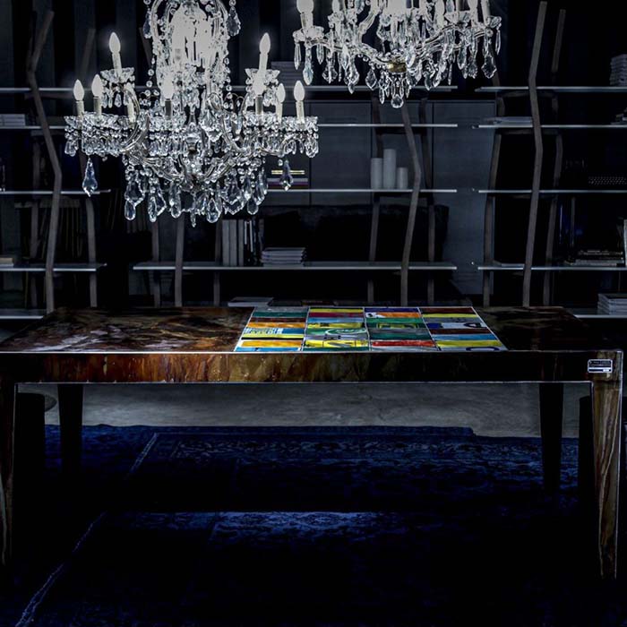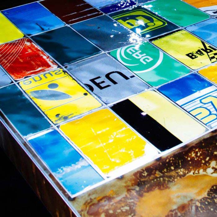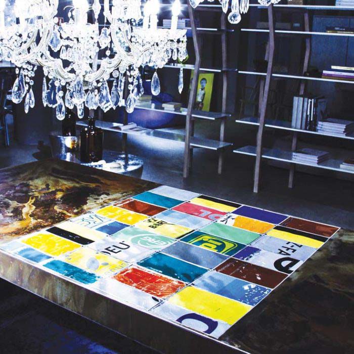 Tavolo in lamiera vergine e mosaico di tessere in lamiera recuperata. Disponibile con finitura antiossidante naturale, ruggine, satinata, lucida.