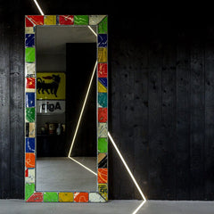Specchiera con cornice in tessere di lamiera recuperata con finitura antiossidante trasparente lucida. Lo specchio è anti sfondamento e sono presenti fori per fissaggio a parete. Realizzabile anche senza specchio, su misura e/o monocromatica.