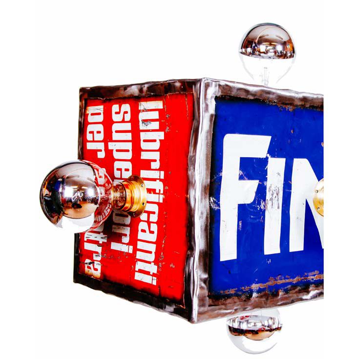 Lampada a sospensione realizzata con lamiere di bidone recuperate saldate tra loro. La sorgente luminosa è costituita da 14 bulbi LED a calotta cromata. Finitura antiossidante trasparente lucida.