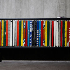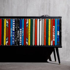 Madia con piedini alti ispirati agli anni ’60. Ante realizzate in listarelle di lamiera recuperata con finitura antiossidante trasparente lucida e con cerniere ammortizzate ed apertura a libro su guida scorrevole. Il corpo è realizzato in lamiera vergine con finitura satinata ruggine o nera. Il vano interno è suddiviso longitudinalmente in due settori da un ripiano.