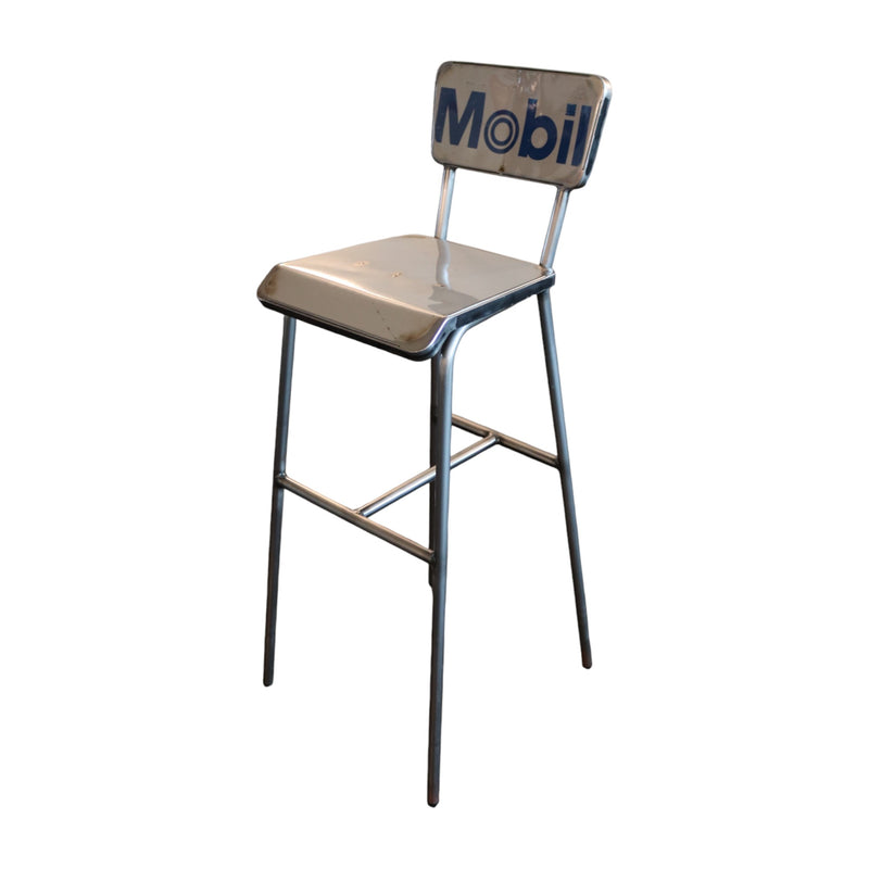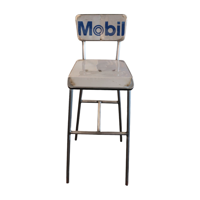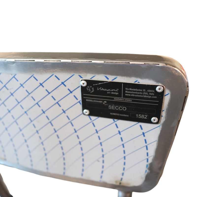 Sgabello con telaio in tubolare metallico con applicazioni di lamiera recuperata nella seduta e nello schienale.
