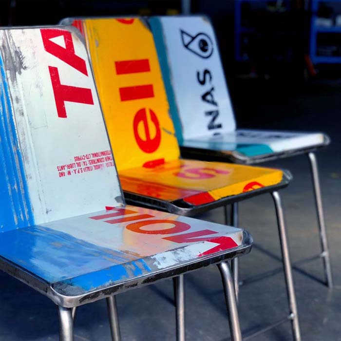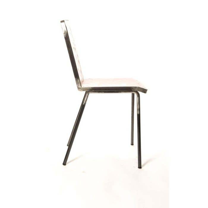 Poltroncina di ispirazione anni ’50 con seduta e schienale monoscocca in lamiera di bidone recuperata e telaio tubolare in ferro grezzo. Finitura trasparente lucida antiossidante.