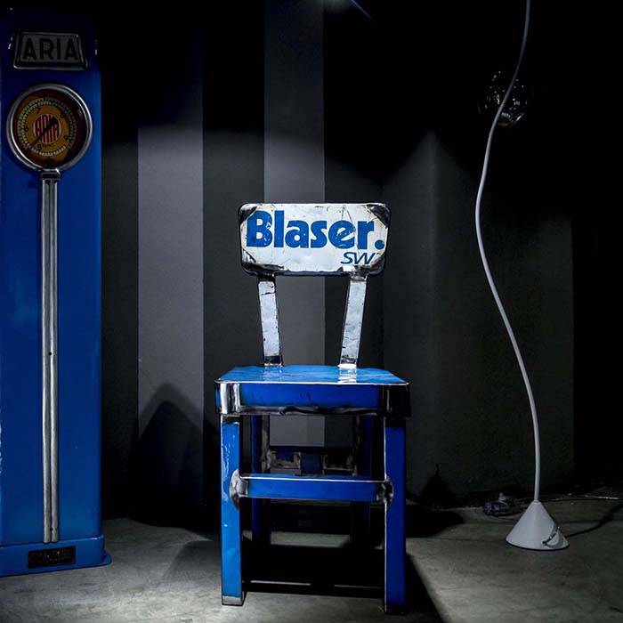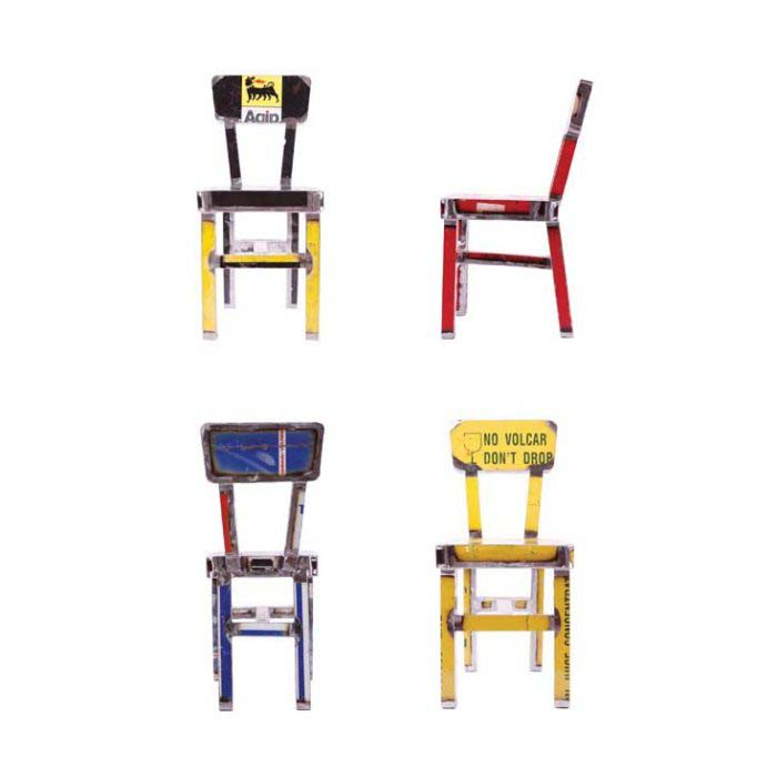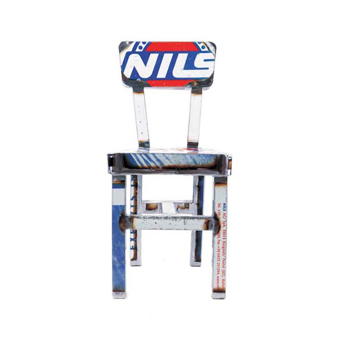 Sedia realizzata interamente con lamiera di recupero e finitura lucida trasparente antiossidante. Ispirata alla tipica sedia da osteria. L’intera struttura non possiede nessun supporto ausiliare interno, non vi è nessun telaio sul quale la lamiera è applicata ma è la lamiera stessa a formare un telaio auto portante.