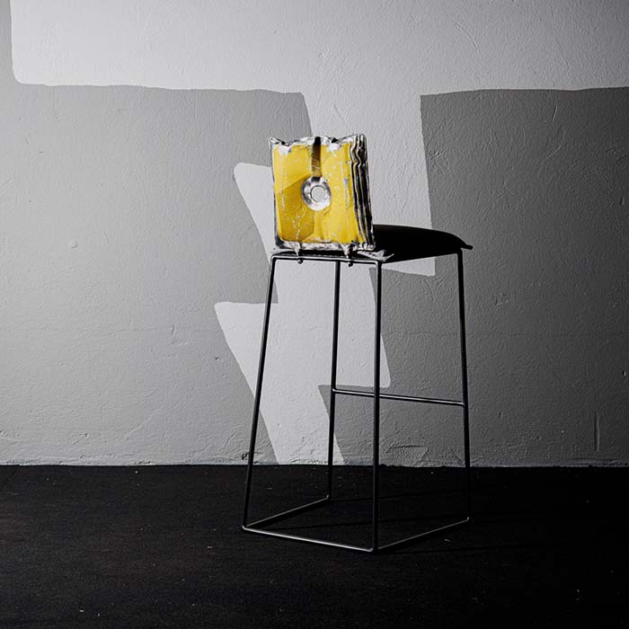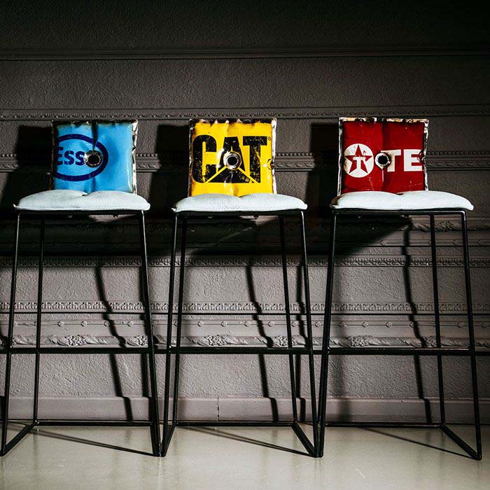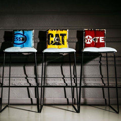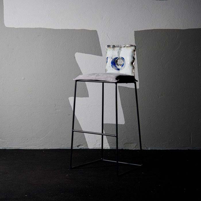 Sgabello con telaio in tondino metallico con verniciatura a polvere nera. Seduta imbottita removibile con agganci calamitati, realizzata in ecopelle di alta qualità. Schienale smontabile realizzato con lamiera recuperata di bidone, gonfiata ad aria. Finitura trasparente lucida antiossidante.