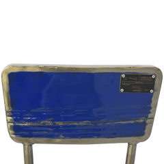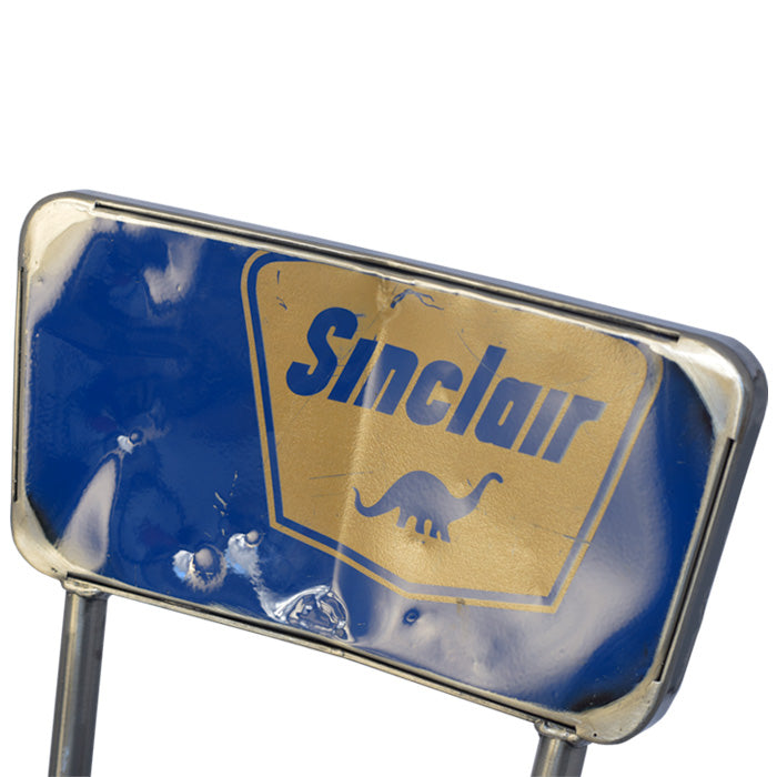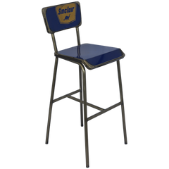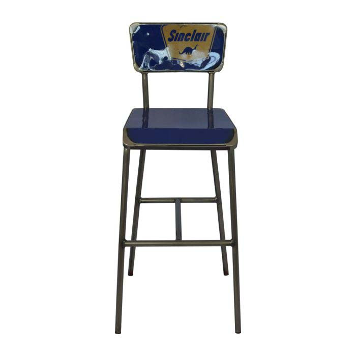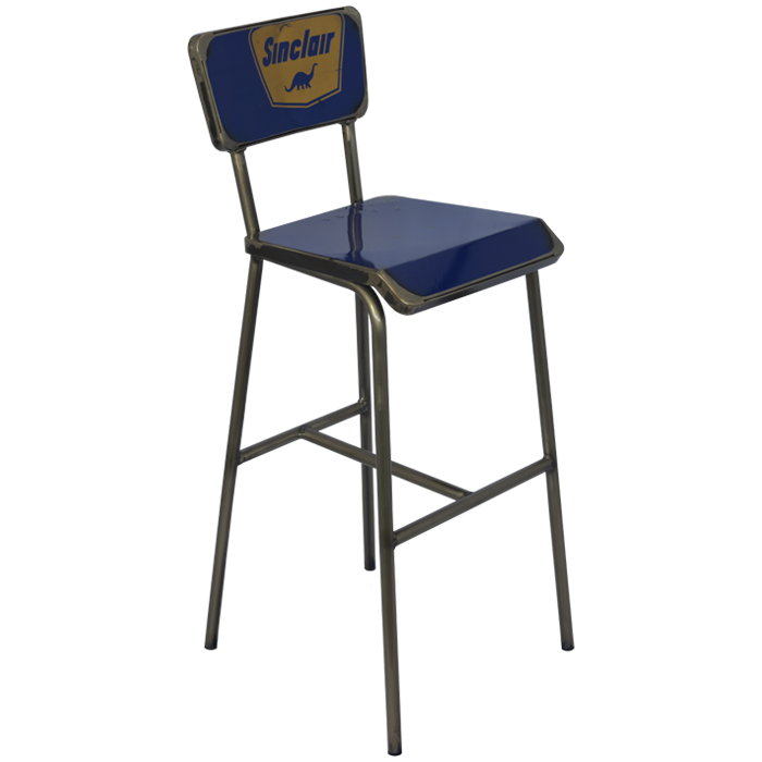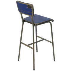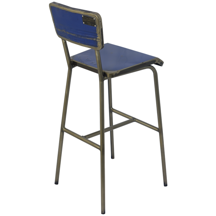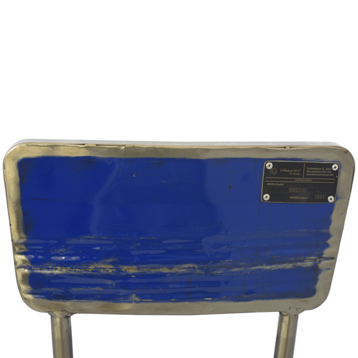 Sgabello con telaio in tubolare metallico con applicazioni di lamiera recuperata nella seduta e nello schienale.