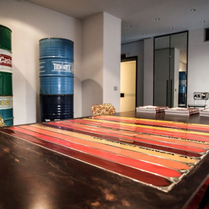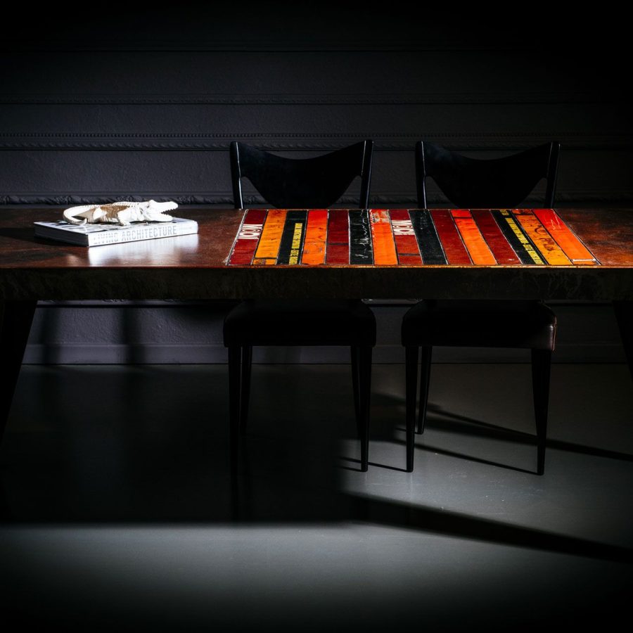 Tavolo in lamiera vergine con inserti in lamiera recuperata. Il profilo delle gambe è piramidale, come lo spessore del piano. Gambe removibili. Colore ruggine con finitura trasparente antiossidante: satinata per il corpo del tavolo e lucida per gli inserti.